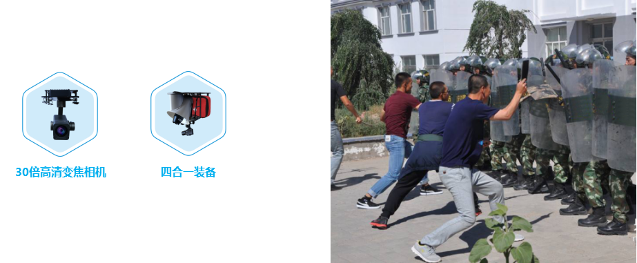 無人機可搭載30倍變焦相機飛抵事故目標區域上空對目標區域進行全方位不間斷的監控,全面掌控事態提供了先決條件。可根據無人機拍攝的資料對事故責任方進行舉證, 同時可以了解目標區域的事件發展情況, 及時形成相應的決策, 防止事態失控。在事態失控時,無人機可搭載四合一掛載攜帶急救包空頭醫療物品,對受傷人員進行及時搶救,同時可以利用掛在上的喊話器對現場進行喊話,疏散人群。