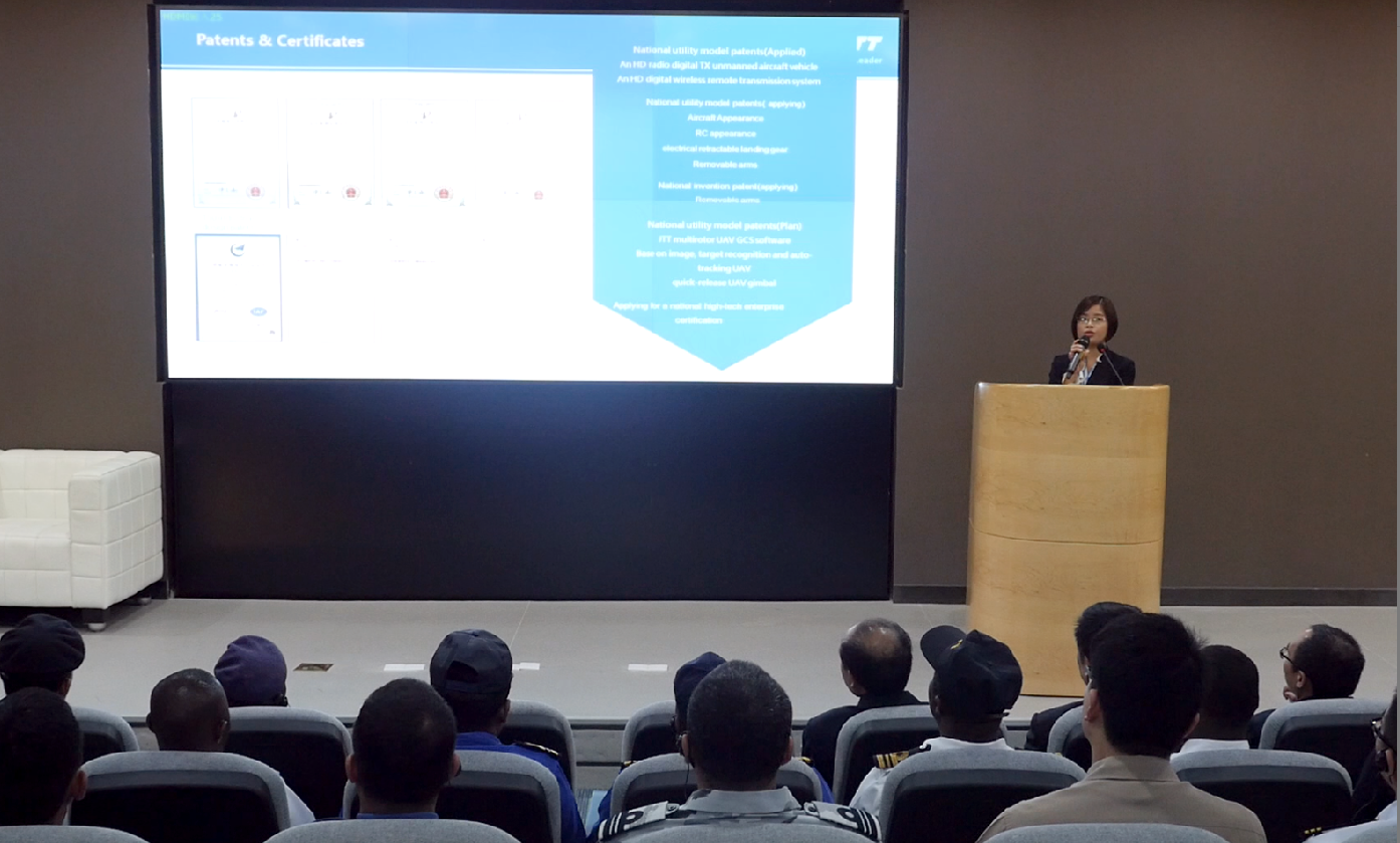 智璟科技COCO女士在演講臺上給使團們介紹JTT工業無人機