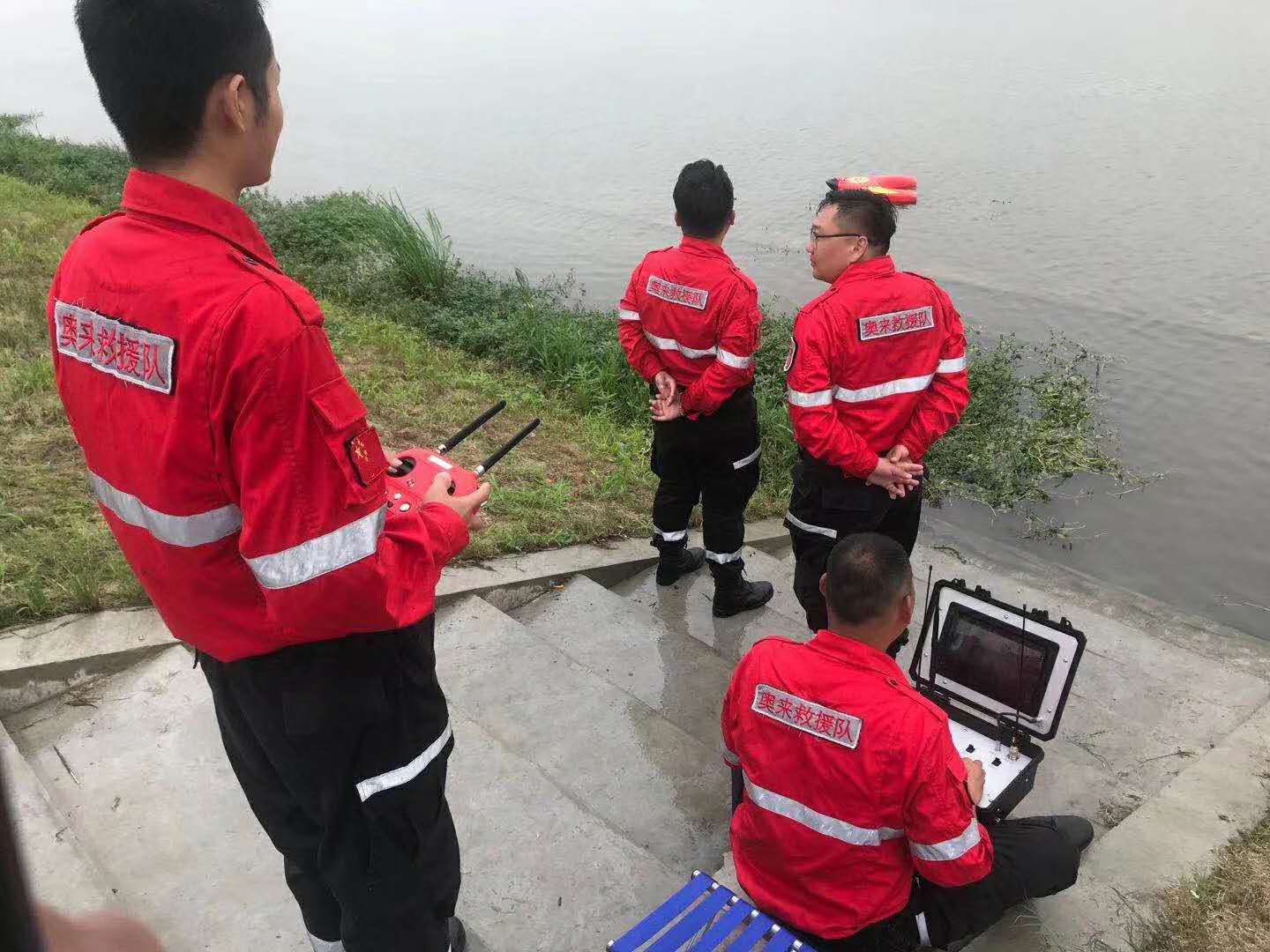 救援小組在岸邊調試準備