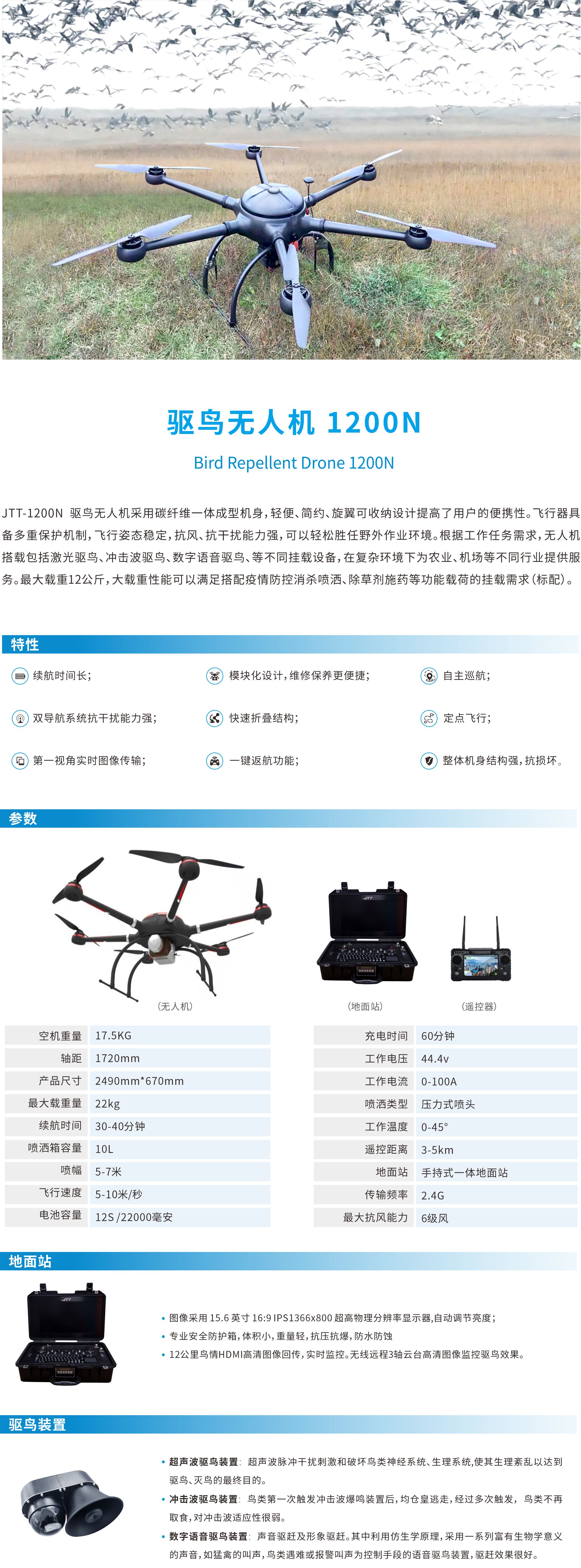 JTT-1200N 驅鳥無人機采用碳纖維一體成型機身,輕便、簡約、旋翼可收納設計提高了用戶的便攜性。飛行器具備多重保護機制,飛行姿態穩定,抗風、抗干擾能力強,可以輕松勝任野外作業環境。根據工作任務需求,無人機搭載包括激光驅鳥、沖擊波驅鳥、數字語音驅鳥、等不同掛載設備,在復雜環境下為農業、機場等不同行業提供服務。最大載重12公斤,大載重性能可以滿足搭配疫情防控消殺噴酒、除草劑施藥等功能載荷的掛載需求