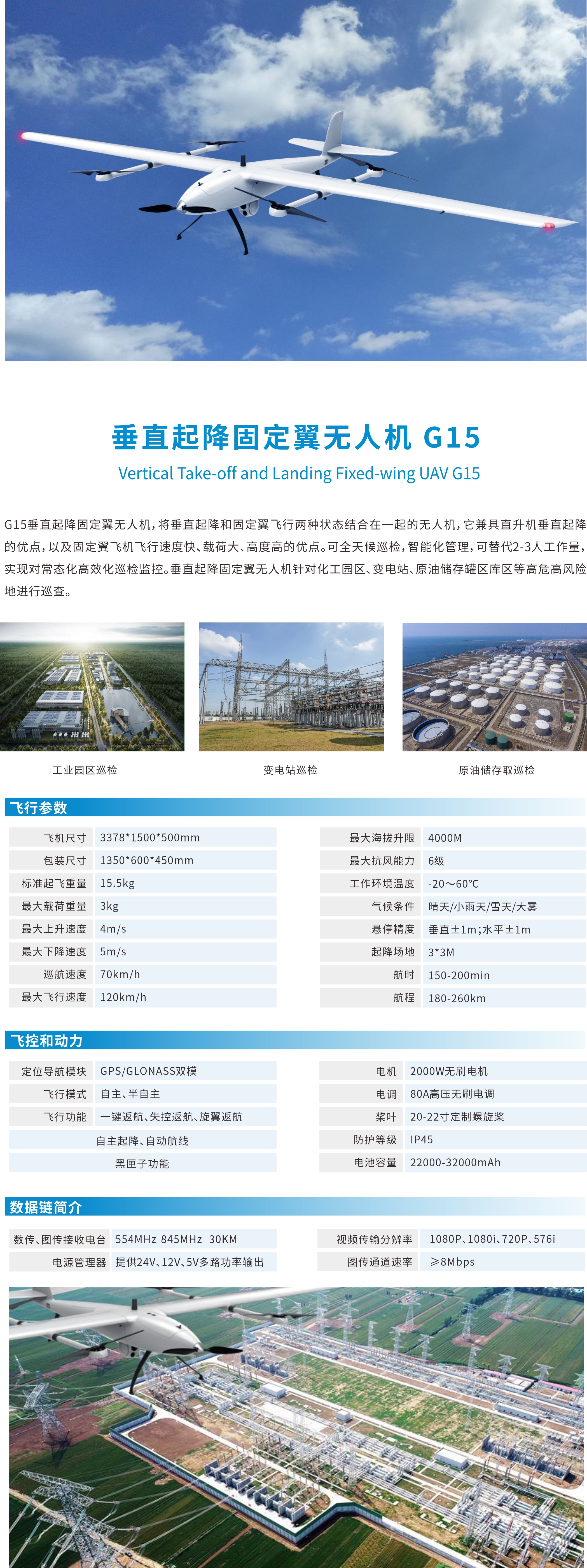 G15垂直起降固定翼無人機(jī),將垂直起降和固定翼飛行兩種狀態(tài)結(jié)合在一起的無人機(jī),它兼具直升機(jī)垂直起降的優(yōu)點(diǎn),以及固定翼飛機(jī)飛行速度快、載荷大、高度高的優(yōu)點(diǎn)??扇旌蜓矙z,智能化管理,可替代2-3人工作量,實(shí)現(xiàn)對(duì)常態(tài)化高效化巡檢監(jiān)控。垂直起隆固定翼無人機(jī)針對(duì)化工園區(qū)、變電站、原油儲(chǔ)存罐區(qū)庫(kù)區(qū)等高危高風(fēng)險(xiǎn)地進(jìn)行巡查。