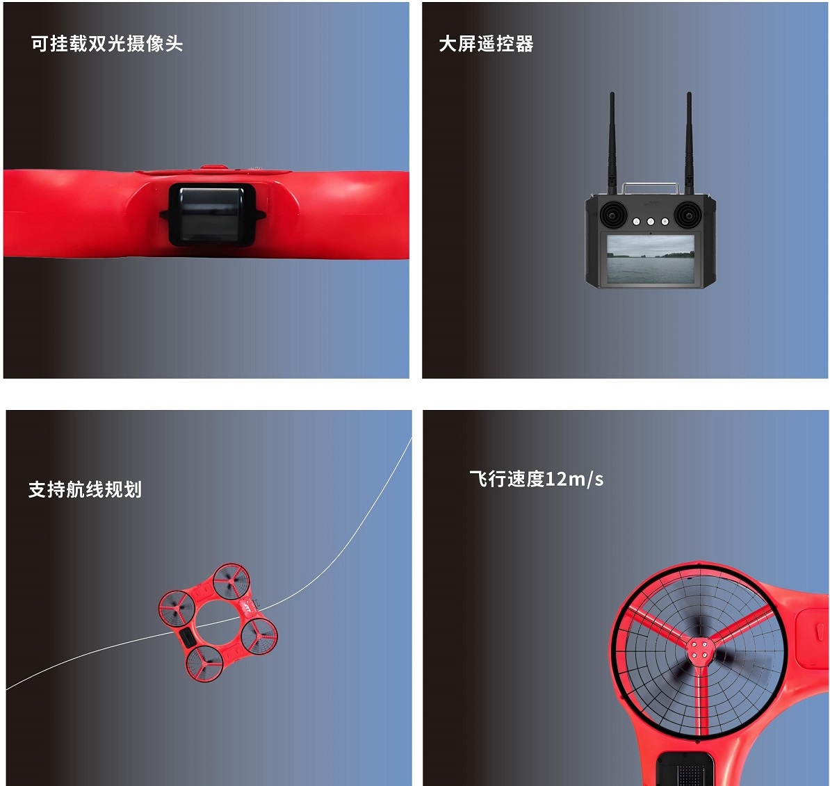 可遙控飛行、波浪水面起飛、空中定點懸停、航線自動飛行、指點飛行、一鍵起飛、一鍵降落;