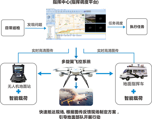 JTT無人機應急指揮調度平臺將無人機飛行平臺與其他業務系統無縫隙地連接成一個有機整體,解決無人機在執法單位應用中存在的技術難點及應用盲區。