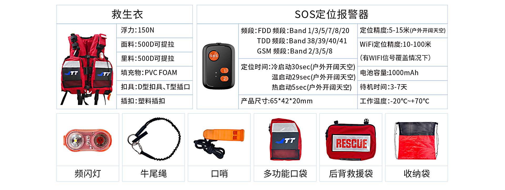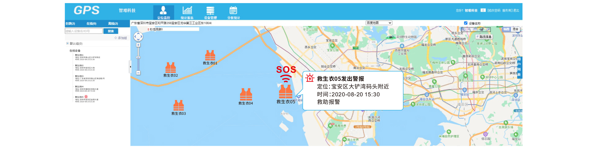 是為防汛搶險救災專門制作的,用于搶險人員穿著和救助落水人員的閉孔泡沫救生衣,可應對極端的水域情況。救生衣前胸設有PFD自救裝置,后背部設有牽引繩連接拉環,同時配備哨笛、反光條、頻閃定位燈、SOS定位報警器等;具有定位功能,在手機APP及后臺管理平臺中能實時顯示定位器位置、電量、軌跡等,在緊急情況下救援人員可以通過SOS一鍵向平臺發出求救預警。它能夠隨時傳遞位置信息,大大提高救援行動效率,及保障救援人員安全。