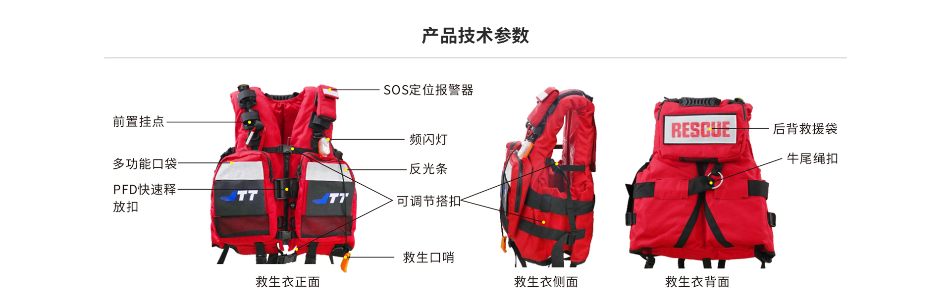 救生衣背面設置松緊帶式熒光棒插槽,領后配有輕型可拖拽把手,救生衣胸前防水口袋設計魔術貼,可貼隊標、姓名貼;胸襟兩側及背后有8條標準反光帶,便于夜間救援